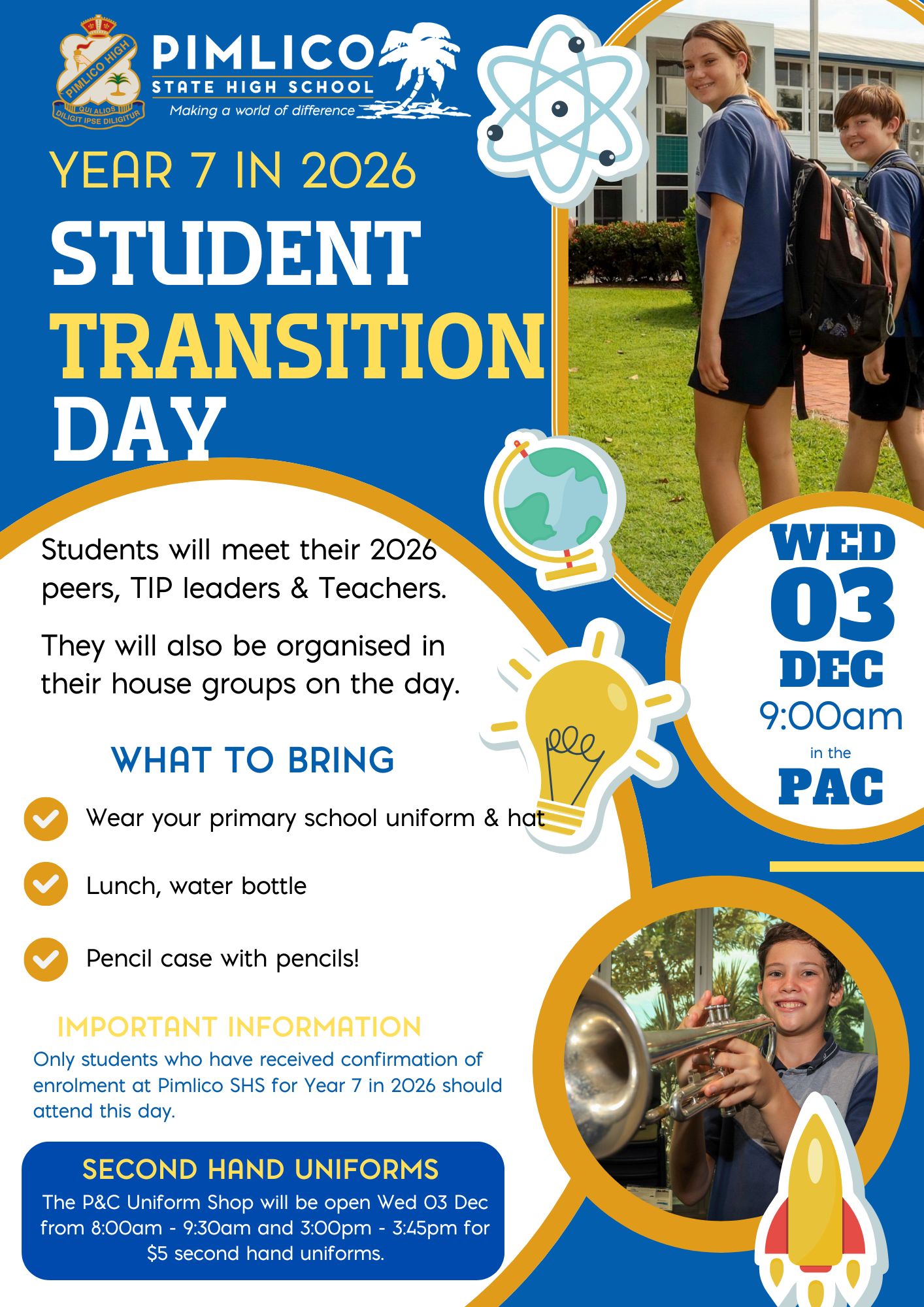 Our year 6 students graduate at the end of the year and head off to high school. There are a number of state high schools in the Townsville region and they coordinate a single transition day where year 6 students with a completed enrolment can attend their chosen state high school for the entire day. Each school plans their own program. This year the State High Schools Transition day will be Wednesday 3 December.