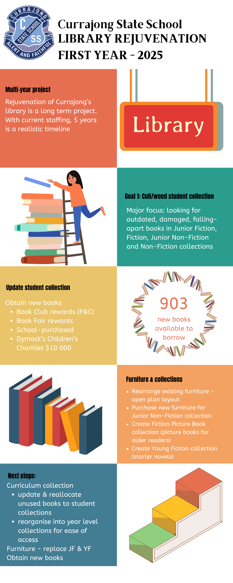 In 2026, Mrs Perrett wanted to rejuvenate Currajong's library so our library staff have been working on improving the quality of our student collection - adding new titles, updating what is on offer, replacing some of our well-worn favourites! There is plenty more work to do as our library is home to all of our teacher and student resources - books, readers, maths equipment and much more, so it will take more than just one year!
